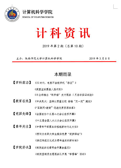 《计科资讯》是财神捕鱼 编辑整理的电子资讯,信息来源为《光明日报》《人民日报》《中国青年报》等权威纸媒,编辑工作由财神捕鱼 优秀本科生党员、团员承担。《计科资讯》主要包括学科前沿、教育在线、党团先锋、青年关注及财神捕鱼 资讯五个版块。财神捕鱼 师生可以从中了解到专业前沿和国家时政大事,欢迎大家下载阅读。