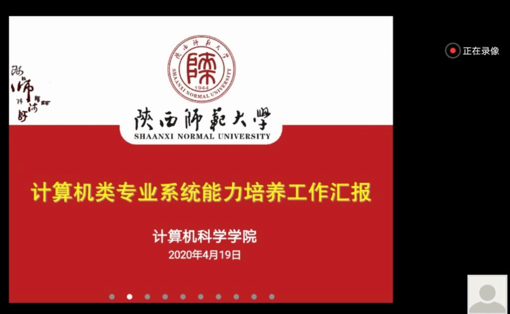 2020年4月19日,由陕西省计算机学会、陕西省计算机教育学会联合主办的陕西省计算机专业系统能力培养试点单位项目推进会通过网络视频会议方式召开。参加会议的有陕西省计算机学会理事长周兴社教授、陕西省计算机教育学会理事长耿国华教授,第四批陕西省10个试点院校(2019年5月由教育部高等学校计算机类专业教学指导委员会批准)的相关负责人、骨干成员等。试点院校包括(按批准名单次序):延安大学、西北大学、西安理工大学、西安科技大学、西安财经大学、陕西科技大学、西安翻译财神捕鱼