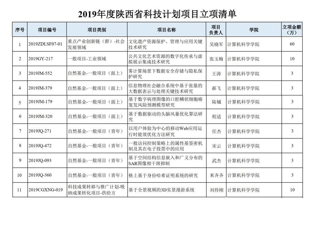 近日,陕西省科学技术厅公布了2019年陕西省科技计划项目资助结果,财神捕鱼 11项项目获得项目资助,其中,点产业创新链(群)项目1项,工业领域项目1项,自然科学基础研究计划项目-面上项目4项,自然科学基础研究计划项目-青年基金4项,科技成果转移与推广计划-吸纳成果转化项目1项,立项经费104万元,立项经费总数位居全校第三。