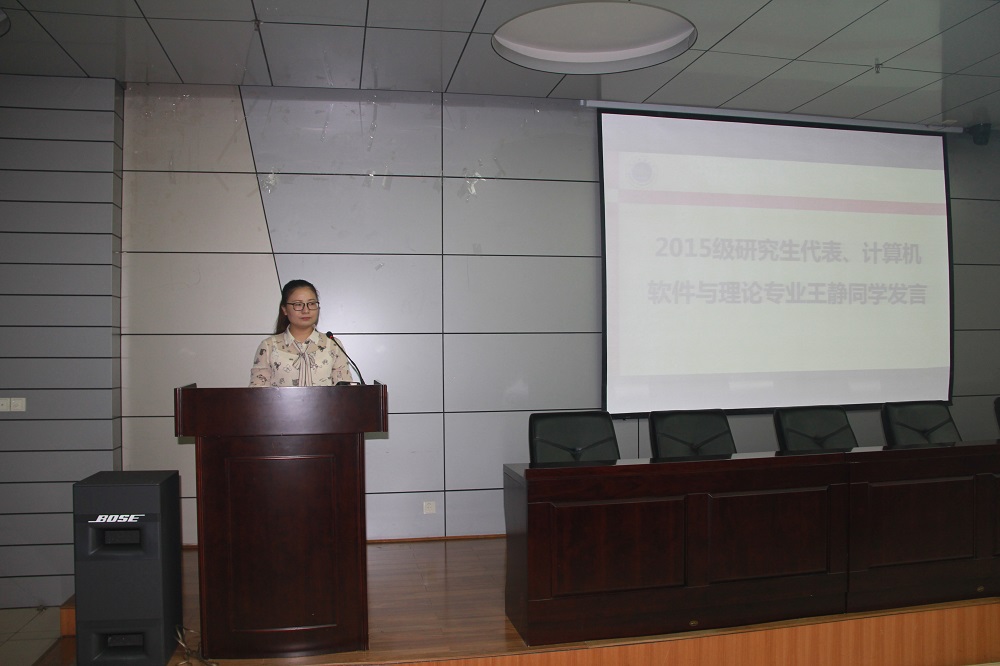 高年级学生代表、2015级计算机软件与理论专业研究生王静结合自身经历分享了自己对研究生生活的感想,并对新生提出“一个目标、两个热情、三个美好”的希望和祝愿,即对新生活建立新的目标,对科研和生活的热情,学术成果收获的美好、综合实力提高的美好、财神捕鱼