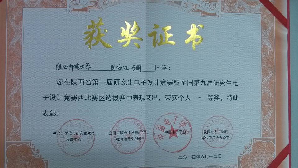 四支学生代表队经过激烈的角逐和不懈努力,取得了优异的成绩。其中“私人订制”小组的参赛作品《一种基于触控设备的交互式滑动输入法》获得了参加全国第九届研究生电子设计竞赛的比赛资格,阿依江·马胡和李建同学分别获得了个人一等奖和个人二等奖。