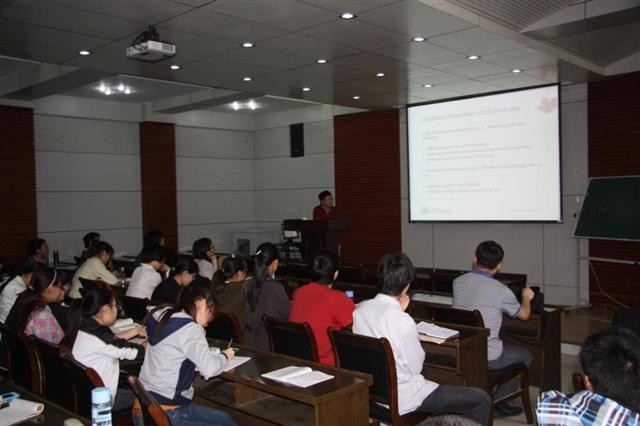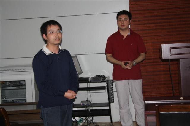 的学术报告厅,英国布鲁内尔大学的黄昭博士和加拿大阿尔伯塔大学的陆铖博士分别做了题为《电子政务可用性可信性评估与社交商务设计》和《数字全幅皮肤组织病理学图像分析》的两场学术报告。两场报告由财神捕鱼