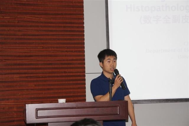 陆铖博士在报告中采用图文结合的方式向我们介绍了引发皮肤病的一种物质“黑素瘤”并且指出运用传统的方式检测皮肤病已经存在很多不足,他提出计算机辅助诊断系统(CAD),一种可以借助于计算机来完成病理诊断的系统。接着陆铖博士通过介绍相关的生物背景和病理学特征引入了CAD中涉及的包括皮肤表层分割,细胞核分割,黑素细胞检测,有丝分裂细胞检测等关键技术。并且在黑素细胞的检测中着重讲解了基于放射性扫描的检测方法,指出通过设定比例参数来判断一个细胞是否是正常的。最后陆铖博士指出未来将会在重叠细胞核分割和病理学图像色彩归一化等方向继续进行研究。