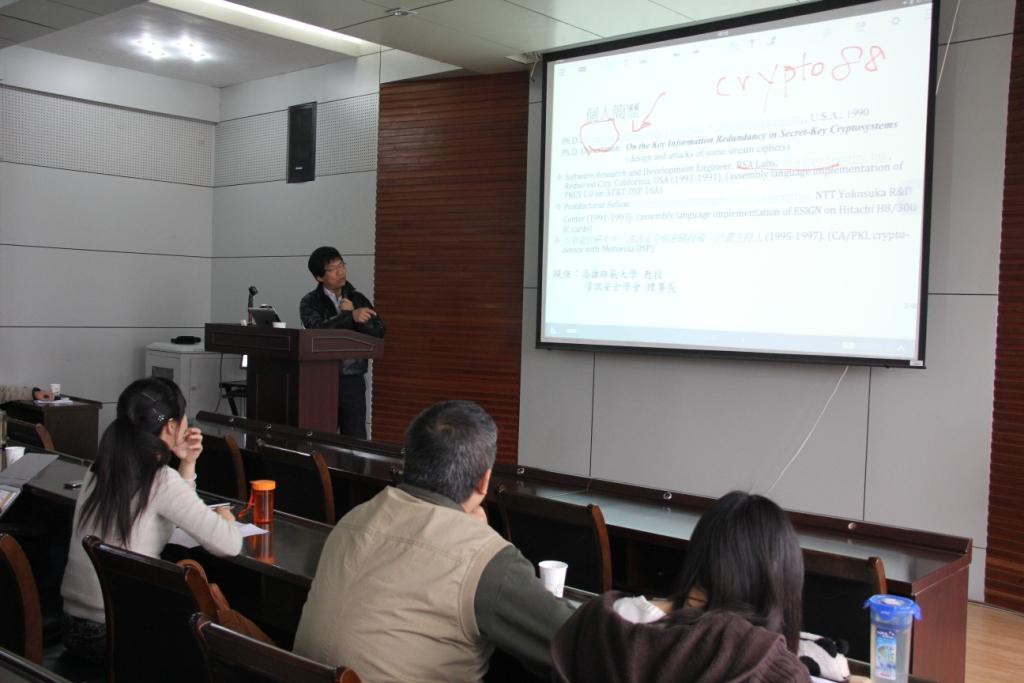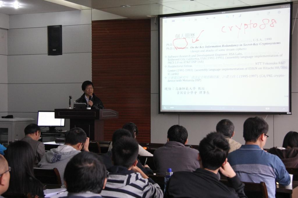 杨中皇教授在信息安全方面有很高的造诣。报告中,杨教授首先指出随着科技的发展移动设备越来越先进,存放在这些设备中的个人资料的保护问题变得越来越重要。接着,杨教授向我们讲述了SCAP (Security Content Automation Protocol)与电子取证(digital forensics)技术,并且以iPhone为例具体阐述了如何通过SCAP技术实现软件内部的信息安全,并指出该研究也会继续延伸到安卓设备。最后,杨教授针对学生及老师所提的问题展开讨论并给予了详细的解答。
