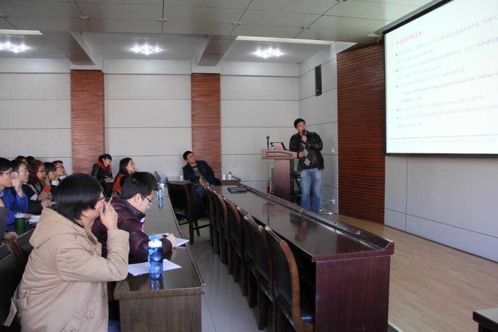 部分教师、博士研究生,以及2012级、2013级硕士研究生也参加了本次报告。 陈勇教授首先为我们做了题为《PEDBellII: A Maple package for the integrability of KdV-type equations》的报告。陈教授首先讲述了Bell多项式的发展历史及其在国内外的研究现状,同时介绍了Bell多项式和可积系统的关联,进而引出其程序化的可能。之后陈教授以“kdv,mkdv”等四种方程为例进行现场的程序演示,让我们真切的感受到复杂的数学问题如何通过编程而高效快速的得以解决。 范恩贵教授接着做了题为《可积系统领域的三个新的研究方向和新进展》的报告。报告中范教授围绕“方程族的代数几何解”、“Ricmann-Hilbert方法及应用”和“正交多项式和随机矩阵”三个问题展开讲解。针对每一部分,范教授向我们介绍问题的发展过程及研究领域的代表人物,接着向我们详细讲解了问题解决的具体流程和相关的概念及所用工具,最后指出待解决的问题以及目前自己所做的工作。 报告最后,姚老师对本次报告作了总结,并再次对两位教授的精彩报告表示感谢,报告会在一片热烈的掌声中圆满结束! 华东师范大学陈勇教授做学术报告 复旦大学范恩贵教授做学术报告 |