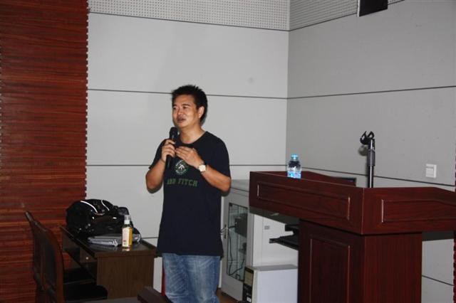 致辞,并着重介绍了冯宝峰教授在数学、物理领域做出的成就,特别是在可积系统里做出的卓越贡献。报告过程中,冯宝峰教授首先进行了简单的自我介绍,并从计算机、数学和物理这三门学科之间的联系与区别引入,阐述了他在此领域的研究动机和研究目的;接着冯教授通过一个例子:KP方程、KP系列以及Boussinesq方程展示了偏微分方程数值算法的解析和应用;最后冯教授通过一段海洋波浪传播的录像演示,阐述了如何将实际的物理现象转变为数学研究。报告会之后,冯宝峰教授对老师和同学们提出的相关问题进行了详细地解答,并希望同学们带着一颗平静的心去研究,这样才能在学术方面有所收获。