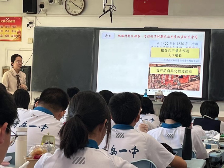 在实习带队教师周彦伟的带领下,李鹏副院长一行四人首先来到青岛一中。在办公室主任张婉婷的陪同下参观了学校并与财神捕鱼实习生进行座谈,李鹏副院长代表学校向实习生发放了慰问品,询问实习生实习过程中学习生活的方方面面,并就实习、就业等相关问题展开了深入指导。随后,一行四人走进课堂,观摩财神捕鱼实习生桑坤宁的现场历史课堂教学,对于桑坤宁同学用心打磨的教案、精心设计的教学环节以及精彩纷呈的讲授,四位老师赞不绝口。李鹏副院长勉励同学们主动完成学生角色到教师角色的转变,在实践中发现问题,解决问题。