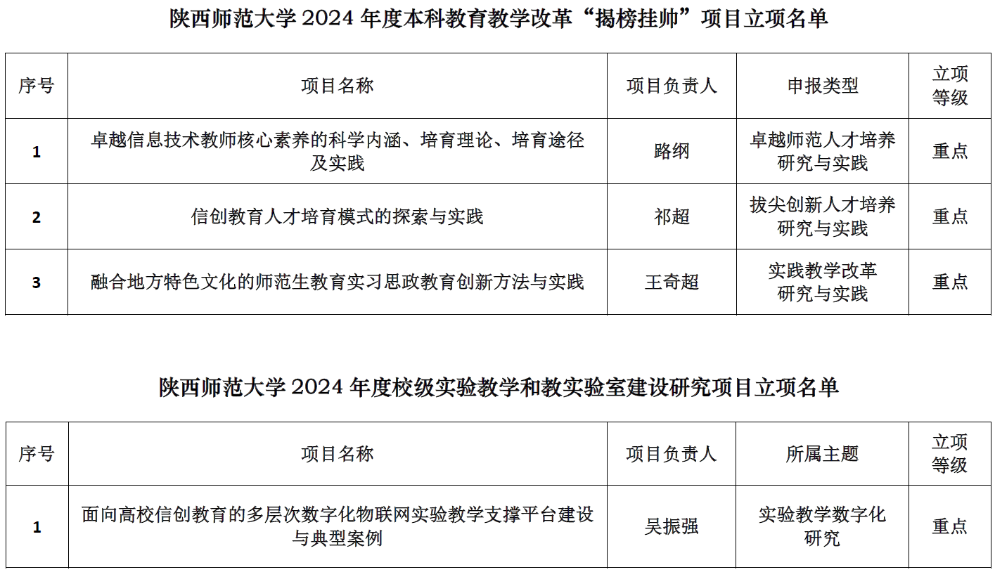 根据《关于做好2024年度本科教育教学改革研究“揭榜挂帅”项目申报工作的通知》《关于推荐申报教育部实验教学和教学实验室建设研究项目的通知》相关要求,经项目组申报、财神捕鱼 推荐、教务处资格审核、专家组评审等程序,财神捕鱼 获批立项校级“揭榜挂帅”教学改革项目3项,其中卓越师范人才培养研究与实践项目1项,拔尖创新人才培养研究与实践项目1项,实践教学改革研究与实践项目1项;获批校级实验教学和教学实验室建设研究项目1项。