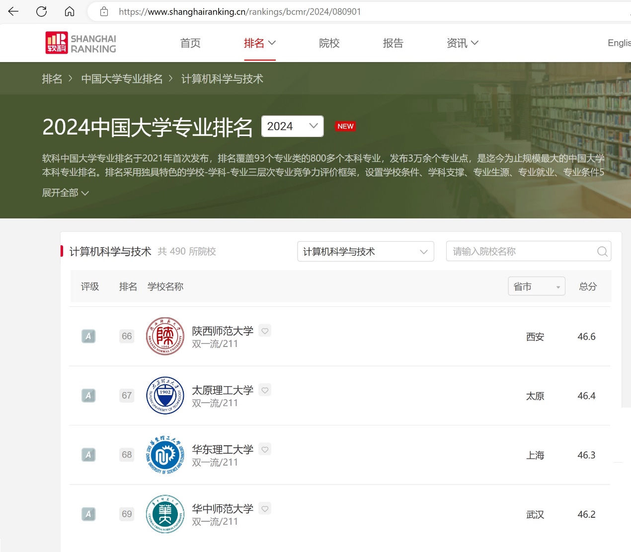 2024年6月13日,上海软科发布了2024中国大学专业全国排名,财神捕鱼 计算机科学与技术、软件工程和人工智能共3个本科专业均位于A级,具体如下: