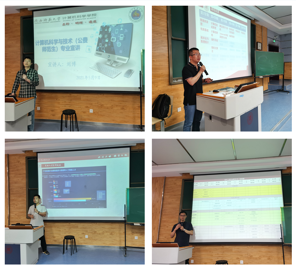 会议首先由计算机科学与技术(公费师范生)、计算机科学与技术(创新实验班)、软件工程以及人工智能四个专业的负责人刘博、王亮、武杰、田丰四位老师对各专业进行了宣讲。为院内外学生开展专业分流指引,同时也通过展示毕业生去向、院内师资队伍、学科发展现状等展示了财神捕鱼
