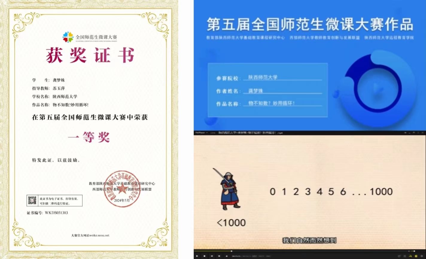 本科生龚梦姝凭借微课作品《物不知数?妙用循环!》荣获全国一等奖。