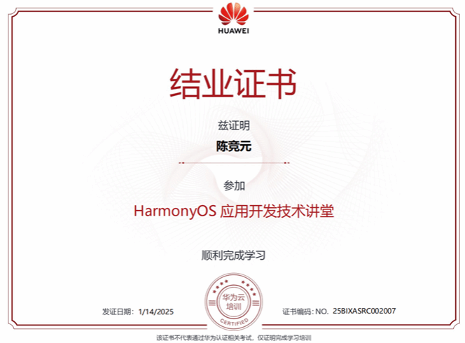 通过本次培训,使学生不仅具备了初步的鸿蒙应用开发能力,还提升了结合华为云进行线上开发的技术水平。后续共有50名同学获得了HarmonyOS应用开发技术讲堂证书。