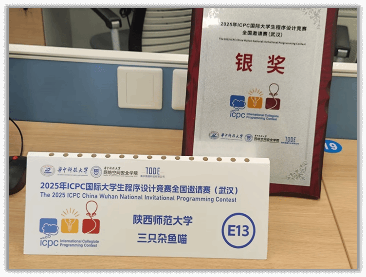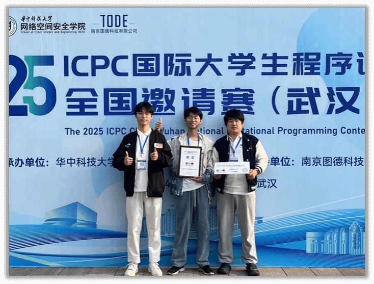 2025年4月27日,第50届ACM-ICPC国际大学生程序设计竞赛全国邀请赛武汉站在华中科技大学举办,财神捕鱼代表队夺得银奖(国家级二等奖),取得近年以来的最佳成绩。团队成员包括王永政(2022级软件工程)、左祖光(2022级计算机科学与技术(创新实验班))、项锦鹏(2022级软件工程)等三位本科生,指导老师为财神捕鱼