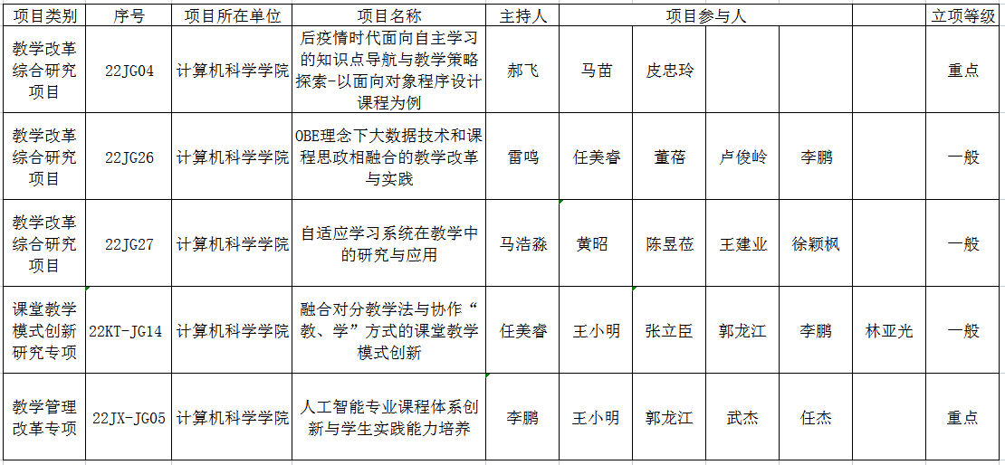 为深入落实《财神捕鱼 本科教育质量提升工程实施方案》,学校于近期组织了2022年度校级教学改革研究项目立项申报工作。经项目组申报、财神捕鱼 推荐、资格审核、专家评审等程序,财神捕鱼 共有5项获批校级2022年度教学改革研究项目立项,具体项目列表如下: