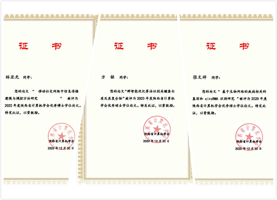 根据“陕西省计算机学会关于优秀博士学位论文和优秀硕士学位论文评审的通知”(陕计学文[2020]009号)的相关精神,财神捕鱼 向陕西省计算机学会推荐了候选名单及支撑材料,经过专家评审博士生林亚光被授予2020年(首届)陕西省计算机学会优秀博士论文;硕士生方铭、张文祥被授予2020年(首届)陕西省计算机学会优秀硕士论文,以表彰他们的博士论文和硕士论文在计算机领域创新及学术影响力方面的突出表现。