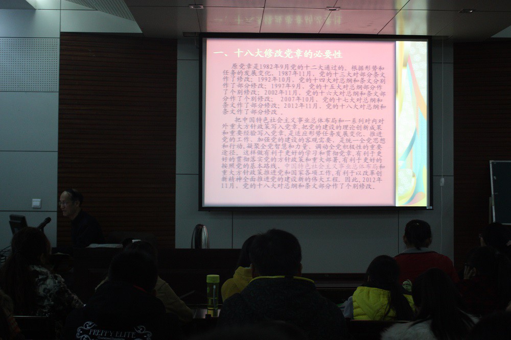 首先,万保民老师向同学们介绍了十八大修改党章的必要性、修改党章的主要特点和原则、我国改革开放以来取得成绩的根本原因和修改党章的五大焦点。随后万保民老师阐述了党的性质及党的宗旨,并通过结合近年来我国发生的具体事件和万老师所教过学生的真实事迹来教导同学要按照党的宗旨带动身边同志一起进步,做出优异的成绩,全心全意为人民服务,维护群众的正当利益,不谋求任何私利和特权。接着万保民老师向同学们详细讲解了党在现阶段的根本任务及党的最低纲领和最高纲领之间的关系,使同学们深刻的理解了党纲的具体内涵。最后,万保民老师希望同学牢记党的性质和宗旨,积极努力,付诸行动,并祝愿同学们早日成为一名光荣的共产党员。此次培训讲座在同学们热烈的掌声中取得圆满结束。