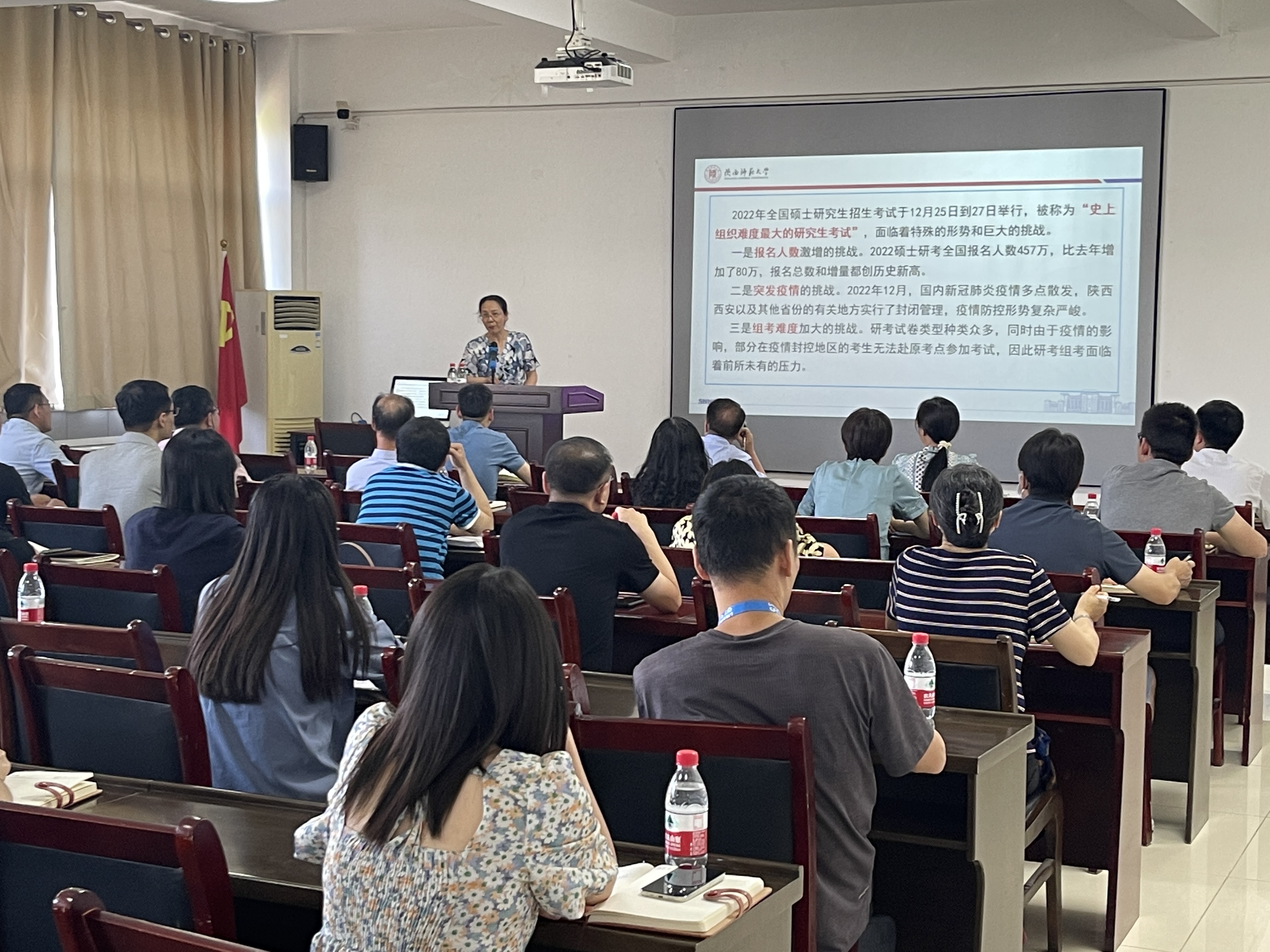 杨祖培从2022年全国硕士研究生招生考试这一“史上组织难度最大的研究生考试”展开,介绍了为实现“应考尽考”和“平安研考”的目标,财神捕鱼与社会各界通力合作,众志成城,迎难而上的奋战历程。此次研考工作的复杂性超乎想象,全校参与研考工作的1500余名教职工、学校党委、省级相关部门以及社会各界集中力量办大事,为保障考生平安考试做出的不懈努力令在场的师生党员深受触动。