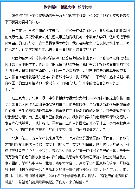 2018级计算机科学与技术专业公费师范生蒋山同学的学习体会和感悟进行了报道。蒋山表示:“张桂梅老师把希望传递给了女中的学生,也用自己的无悔与担当提振了我们有志于投身教育事业的年轻人的士气,鞭策我们奋勇前进。作为一名公费师范生,我志愿投身西部基础教育事业,张桂梅老师就是我的榜样。我将践行学校‘扎根西部、甘于奉献、追求卓越、教育报国’的西部红烛精神,教书育人、脚踏实地,让青春绽放在西部教育的热土上。”