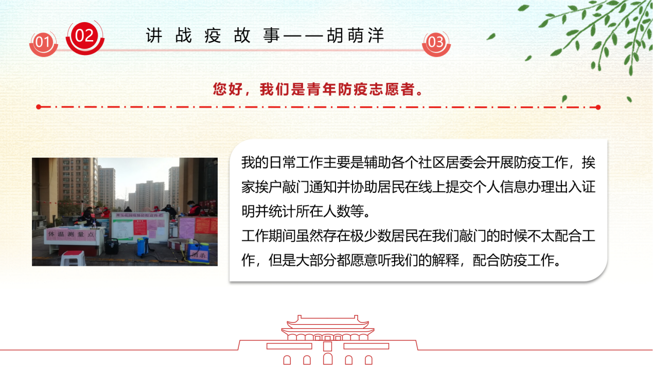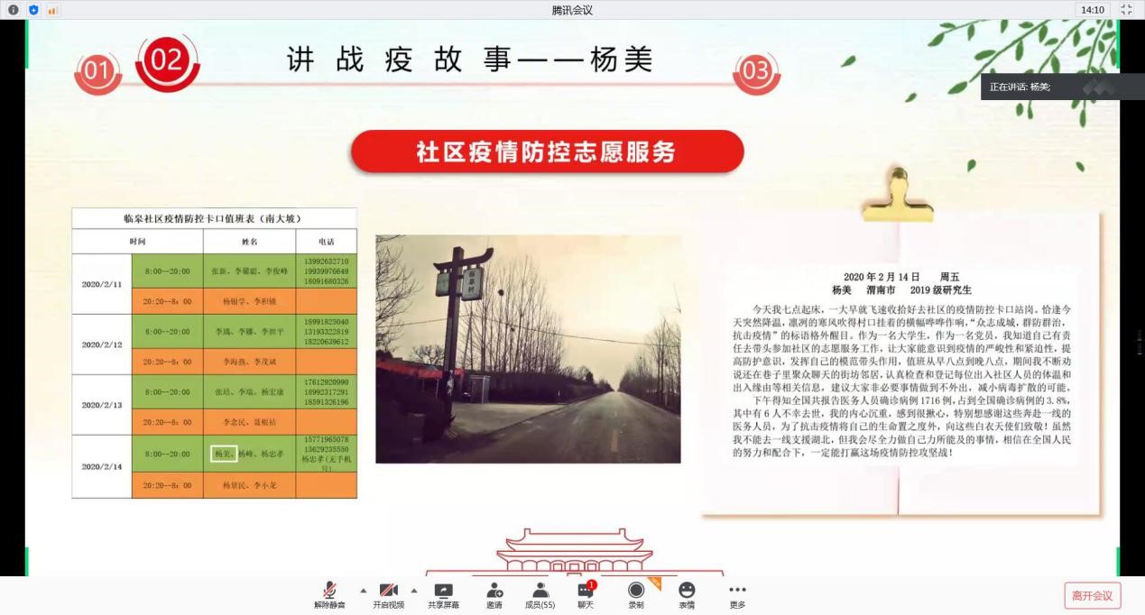 在“讲战疫故事”环节,支部党员胡萌洋、杨美以及积极分子代表宋海林分别围绕疫情期间参与社区一线疫情防控志愿服务、协助处理财神捕鱼