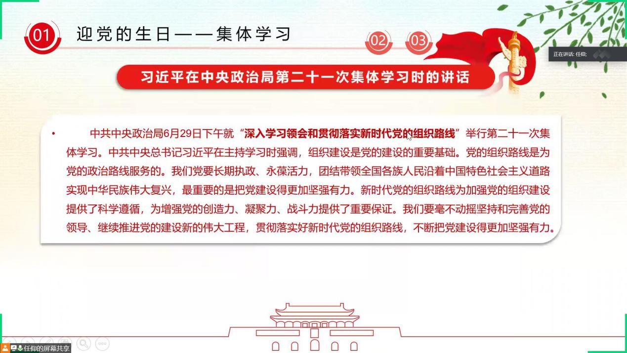 随后,在各党小组组长的带头朗读下,大家共同学习《习近平在中央政治局第二十一次集体学习时的讲话》。习近平总书记强调,我们要毫不动摇坚持和完善党的领导、继续推进党的建设新的伟大工程,贯彻落实好新时代党的组织路线,不断把党建设得更加坚强有力。