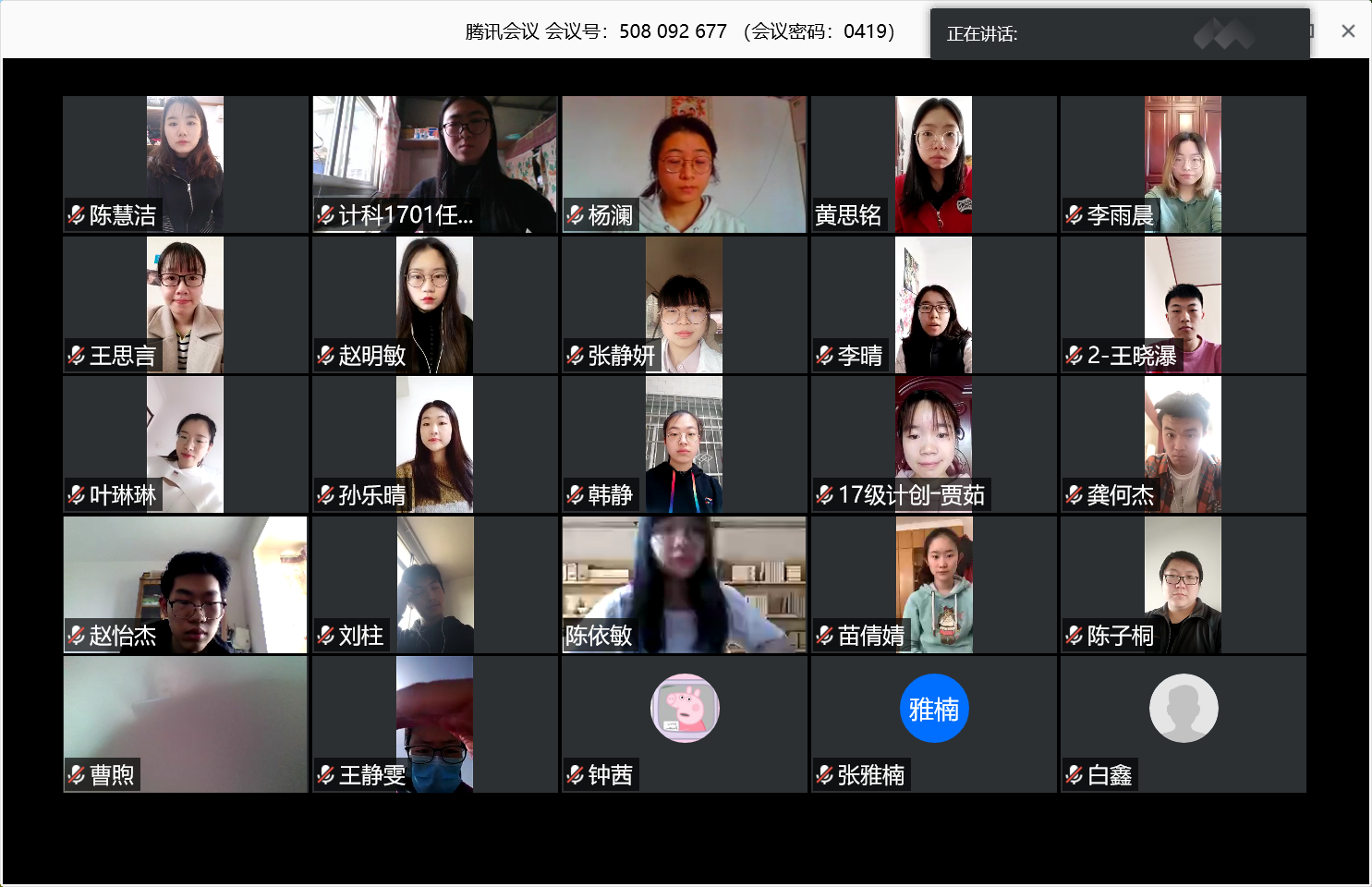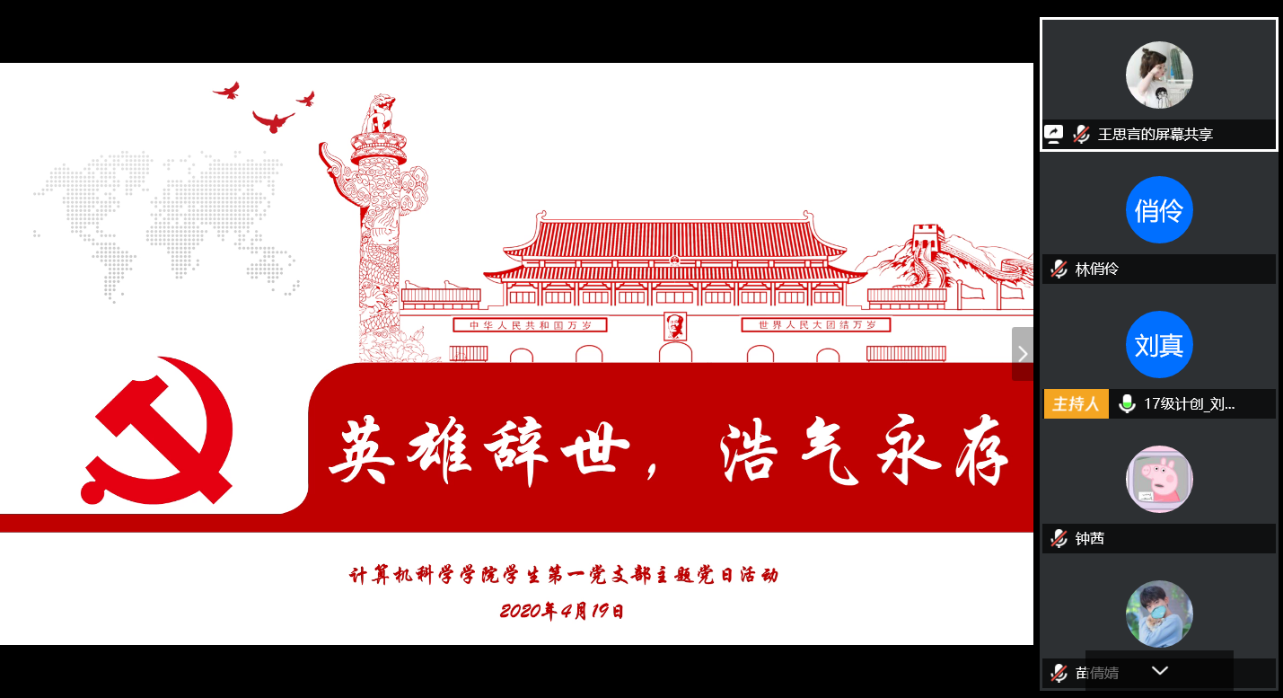 在最后的总结发言中,陈应权老师谈到,要珍惜别人付出辛苦劳动甚至是生命为我们创造的美好生活和疫情防控良好局面,要用自己的实际行动去捍卫来之不易的成果;要时刻铭记包括这次疫情的重大事件中为大家舍小家的平凡英雄们,不忘来路、始知归处;要透过我们所遇见的每一次灾难去反思,反思我们的言行举止是否符合我们的党员身份。王楠老师首先向同志简单地介绍了自己自疫情以来在学校疫情防控工作指挥部的工作。她表示,从国家层面来看,这次疫情大考彰显了社会主义制度的优越性,体现了人类命运共同体这一观点的正确性,是一场生动的爱国主义教育;从社会层面来看,尽管存在极少部分不和谐声音,但绝大多数中国人都主动担起社会责任,相信科学、相信权威,不信谣、不传谣;从个人层面来看,无论是奔赴一线还是居家抗疫,都是在为我国疫情防控工作贡献自己的力量。最后,她希望同学们在家学习生活之余,不忘积极参加劳动,锻炼身体,以最好的身体和心态迎接生活中的每一天。