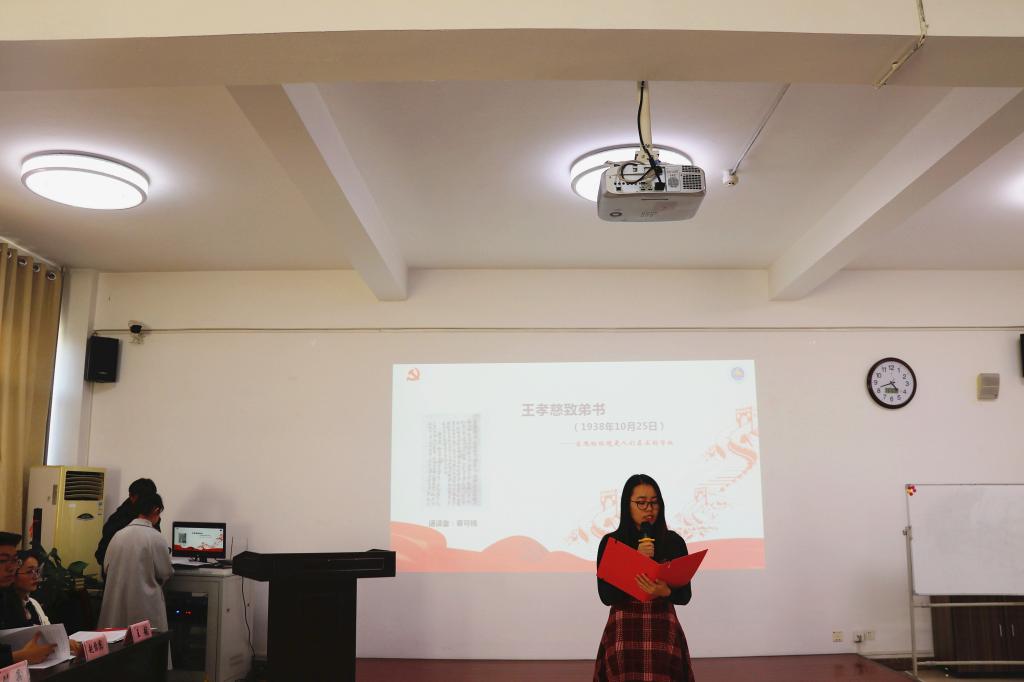研究生党支部书记、2018级计算机应用技术专业硕士刘亚灵同志诵读了杨开慧致堂弟杨开明的家书,“说到死我并不惧怕”。信中,杨开慧流露出作为女性柔弱的一面,但她更多地表现出不同于一般女子的坚定和勇敢。