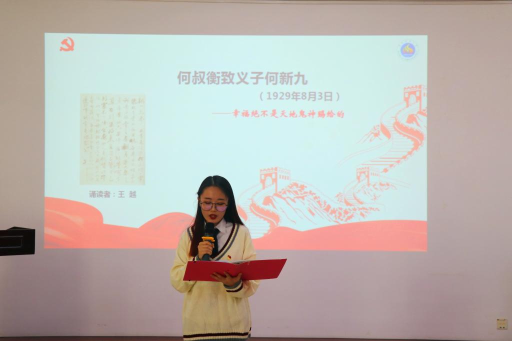 学生会主席、2017级计算机科学与技术专业本科生王越诵读了何叔衡致义子何新九的家书,“幸福绝不是天地鬼神赐给的”,充分体现了何叔衡对义子的殷切期盼以及非常坚定的革命信念。