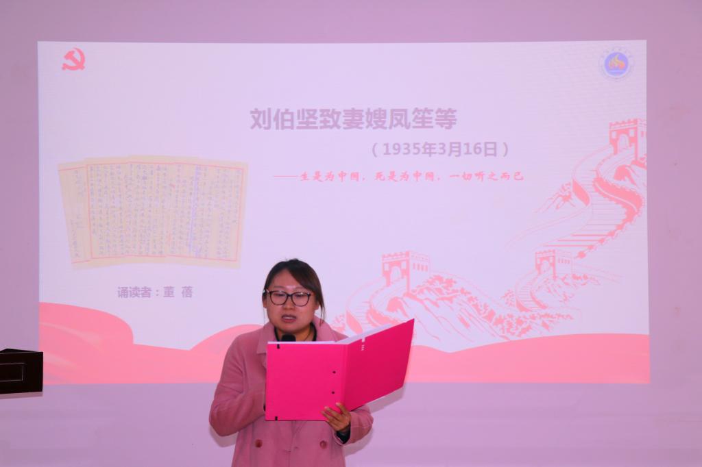 普适计算支部党员董蓓同志诵读了刘伯坚致妻嫂凤笙等的家书,“生是为中国,死是为中国,一切听之而已”。刘伯坚同志在革命原则问题上毫不妥协,在革命斗争中不忘理想信念,在个人生活中扛起家庭责任。
