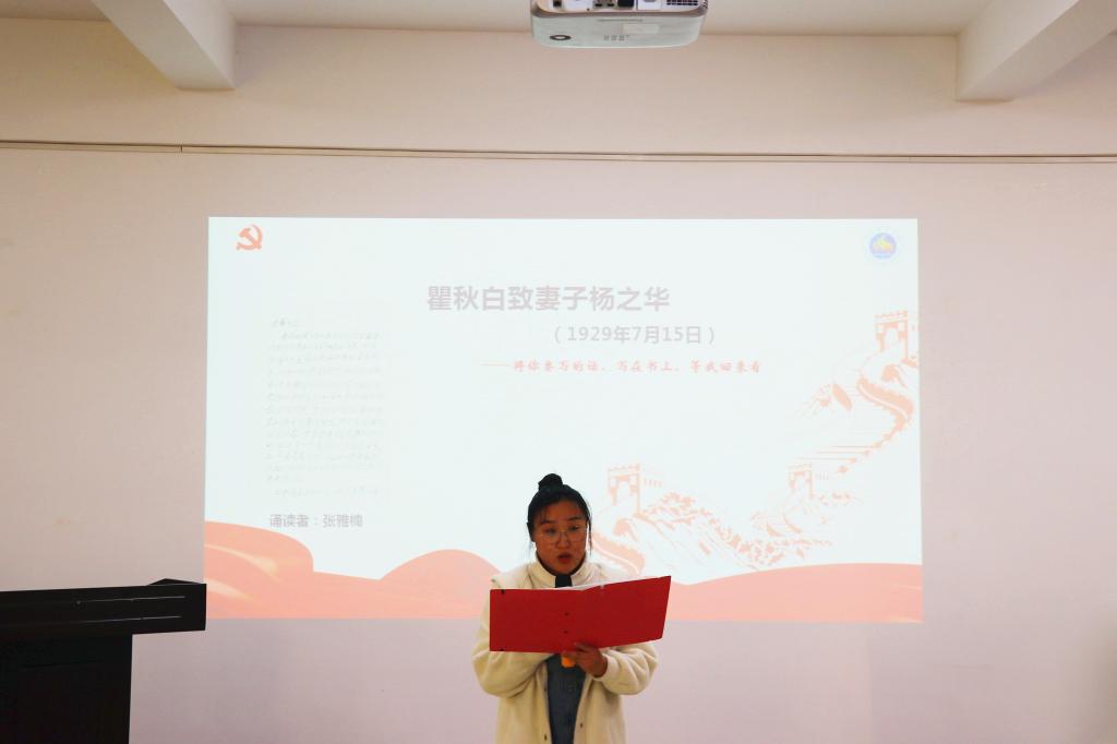 马列理论读书社社长、2017级计算机科学与技术专业本科生张雅楠同志诵读了瞿秋白致妻子杨之华的家书,“将你要写的话,写在书上,等我回来看”,这是共产党人对妻子最浪漫的告白。