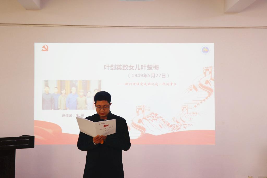 普适计算支部宣传委员李鹏同志诵读了叶剑英致女儿叶楚梅的家书,“你们必须完成你们这一代的责任”,叶剑英通过书信督促教育子女,引导并鼓励他们好好地为人民服务,为他们指明正确的人生道路。