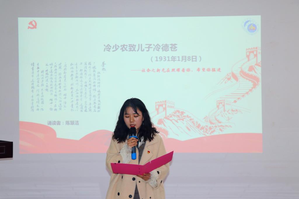 团委副书记、2017级计算机科学与技术专业陈慧洁同志诵读了冷少农致儿子冷德苍的家书,“社会之新光在照耀着你,希望你猛进”。这一封信寄托着冷少农对儿子无尽的爱和深切的期望,体现了革命者超越小我、献身革命的大爱。