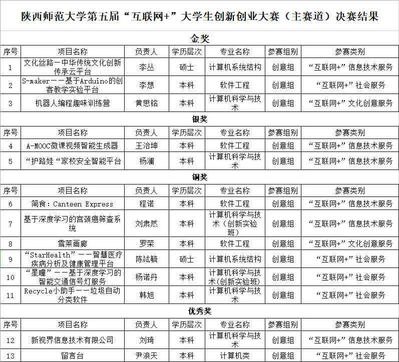 3个金奖项目与2个银奖项目共5支队伍被学校推荐参加第五届中国“互联网+”大学生创新创业大赛陕西省省级复赛,在学校推荐的18支队伍中,占比27.8%,数量同样在全校各单位中名列第一。