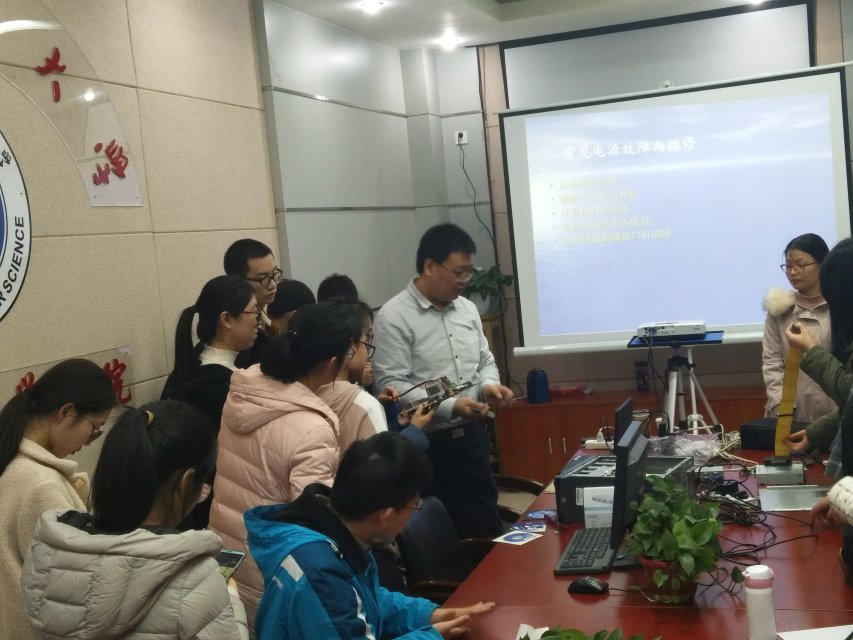 副院长董春生为全体队员开展了“硬件组装与维护”主题业务培训,并针对性地就3月5日赴财神捕鱼附属幼儿园开展维修活动进行了详细的技术指导,队员们受益匪浅。