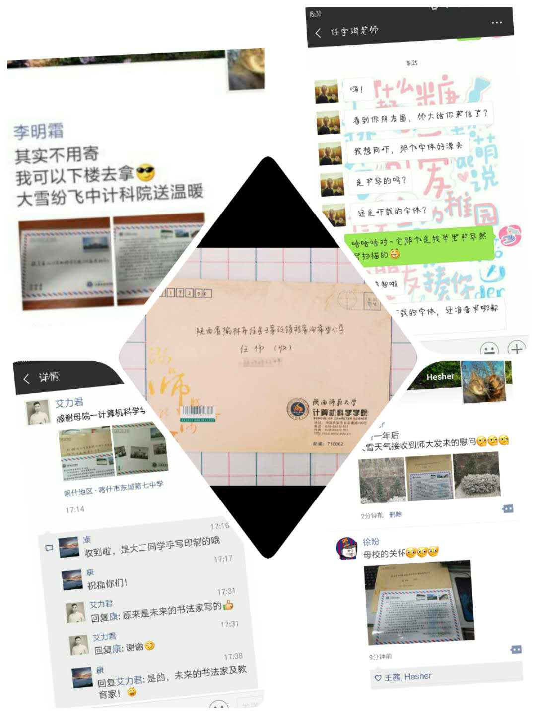 !收到慰问信的一瞬间,觉得很感动!时间过得非常快,一转眼在新学校度过了一个新学期!而我也常常能够回想起在师大和计科院的日子,快乐,充实!愿同母院一起,不忘初心,继续前行!”
