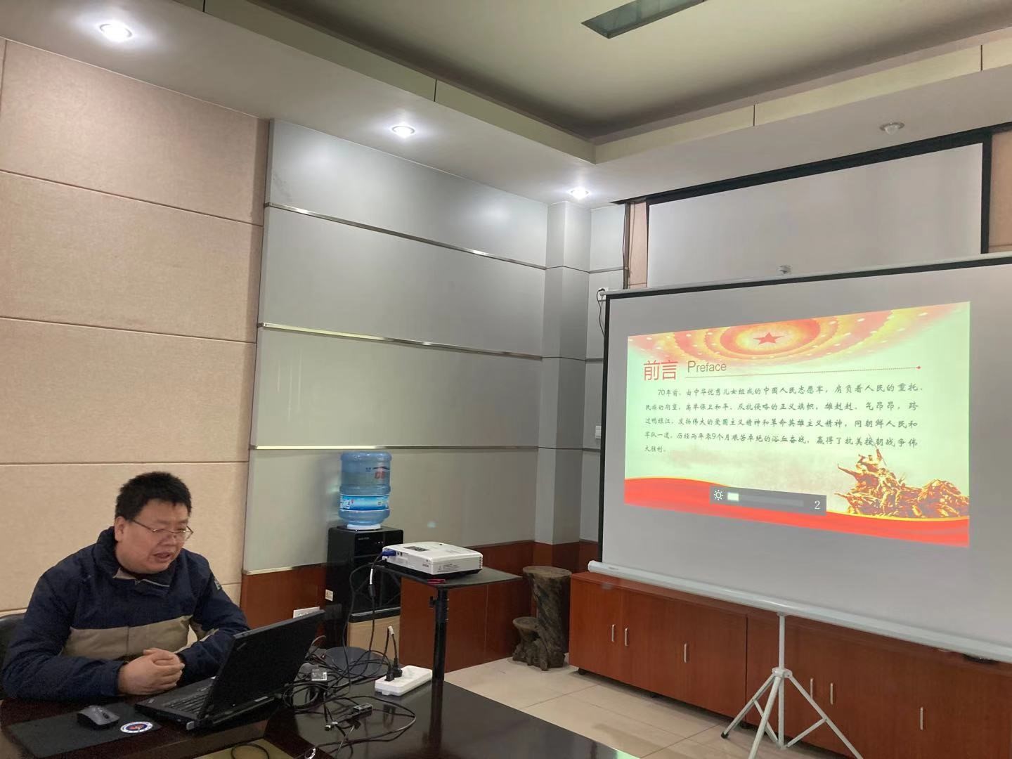 为提高观影效果,帮助同志们更好理解抗美援朝战争的历史背景和重要意义,观影前,支部书记董春生同志以《抗美援朝70周年》为题为同志们讲党课。