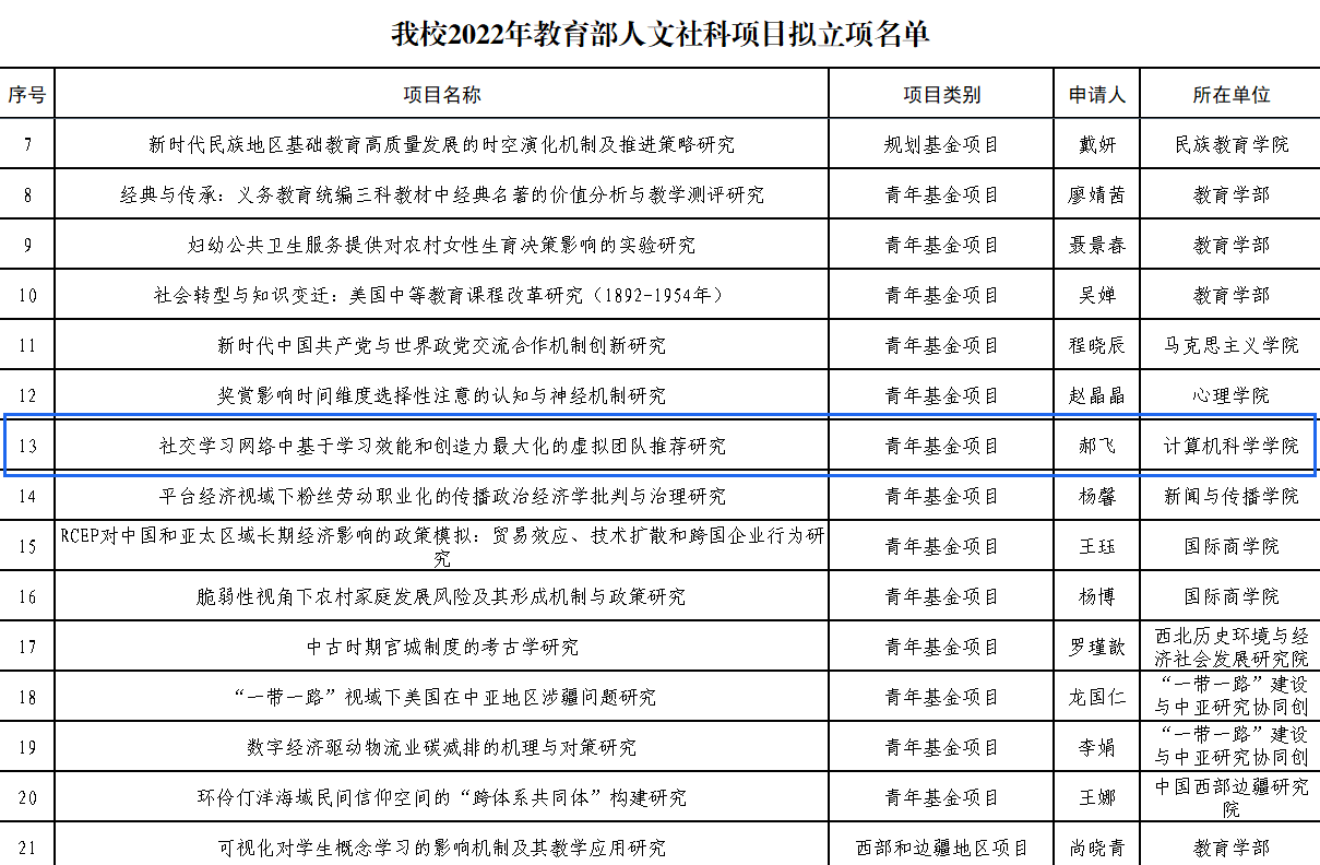 近日,教育部社科司公布了2022年度教育部人文社会科学研究一般项目的评审结果,财神捕鱼 郝飞副教授申报的《社交学习网络中基于学习效能和创造力最大化的虚拟团队推荐研究》获批资助立项。此次教育部人文社科基金项目的获批,是财神捕鱼 在科学研究、学科建设、师资培育等方面持续推进、不断努力的结果。
