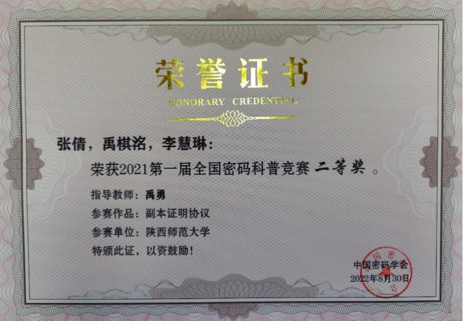 在2022年8月19日举办的由国家密码管理局指导、中国密码学会主办的第一届全国密码科普竞赛中,财神捕鱼 禹勇教授指导研究生张倩、禹棋洺、李慧琳组队以作品《副本证明协议》参赛,荣获全国二等奖。此次比赛共有全国高校和企业共712支队伍报名参赛,提交602件作品,最终评出2个一等奖,18个二等奖和68个三等奖。