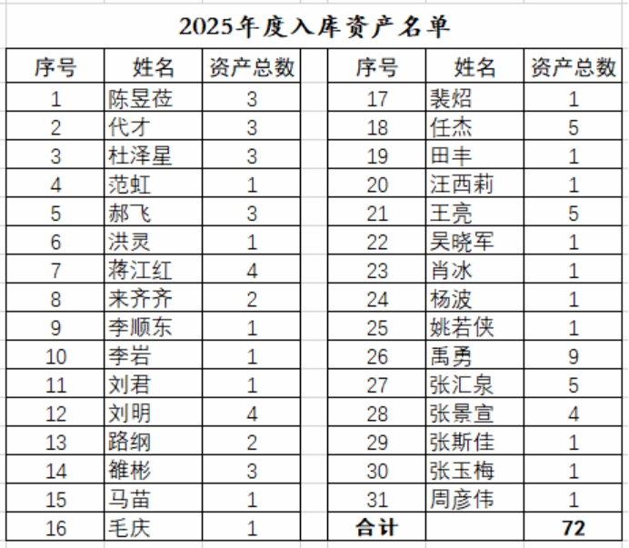 对2025年度(2025年1月1日至2025年12月31日)通过变更领用人、自购、接受捐赠等方式新增的各类资产,包括:仪器设备、家具、装具、用具、无形资产等。