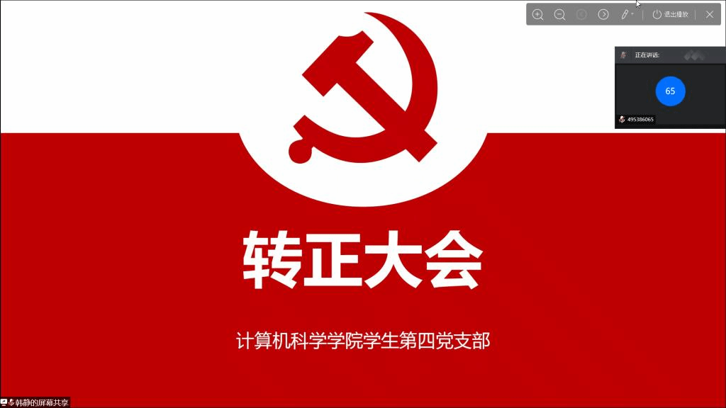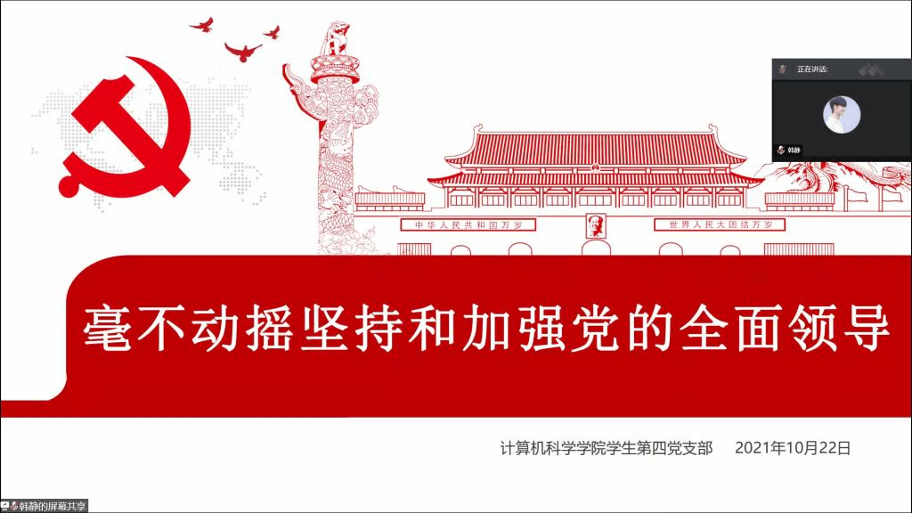 转正大会结束后,学生第四党支部在线上举行了以"毫不动摇坚持和加强党的全面领导"为主题的支部学习活动,由支部组织委员韩静同志领学。