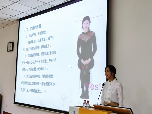 随后,袁老师详细为大家介绍了不同的眼神所表达的不同含义,包括关注型注视、公务型注视、社交型注视和随意性注视等。同时,通过互动的方式,向大家示范标准的站姿、坐姿、鼓掌方式与握手等基本礼仪,并纠正了同学们在细节上的错误,现场气氛活跃,同学们收获颇丰最后,袁玥老师总结了面试时合适的着装与妆容要求。