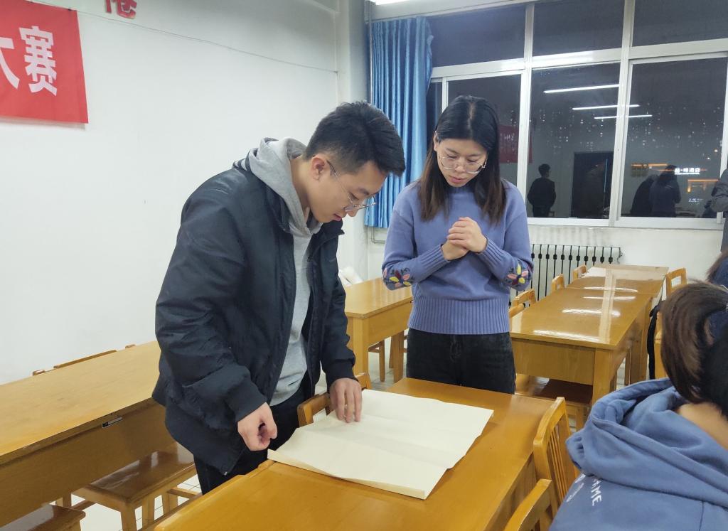 选手提交作品后,文化服务队志愿者与学生会同学对作品进行悬挂,与会嘉宾老师与同学共同欣赏评鉴。根据评委老师评分,王明慧、董策典获得大赛一等奖;刘玲嘉、卢迅、文天娇获得大赛二等奖;姬卓君、姜晓雯、刘庚鑫、李鑫、蒋山获得大赛三等奖。孙毅、姜晓雯、陈雅惠、刘庚鑫、王明慧、陈川、邱舒阳获得“翰墨书香”书法培训班优秀志愿者。王小明、黄怀平、袁冰、郭康凌、安琪分别为大赛获奖选手以及书法班优秀志愿者颁发荣誉证书。