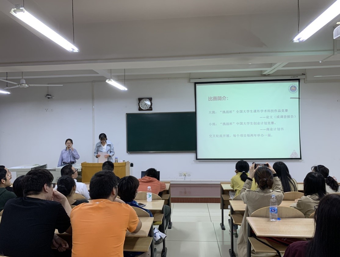 2018级和2019级学生,由侯秋源、张美娟、马玉晨三位同学从大赛简介、项目类型、赛程安排、前期备赛四个方面为同学们进行赛事介绍和经验分享。三位同学详细介绍了大赛内容、参赛项目分类、赛程安排,同时向同学们分享了参赛项目、指导老师的选择方向,以及参赛作品的书写格式和规范,为同学们参赛提供了很大的帮助。