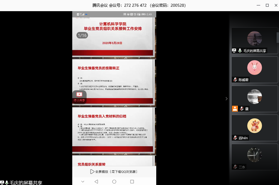 于5月28日下午在腾讯会议平台组织召开2020届毕业生党员组织关系转接工作会议。党委副书记袁冰、本科生支部书记毛庆、研究生支部书记皮安琪、刘亚灵及全体本科生、研究生毕业生党员参加了会议。会议由财神捕鱼
