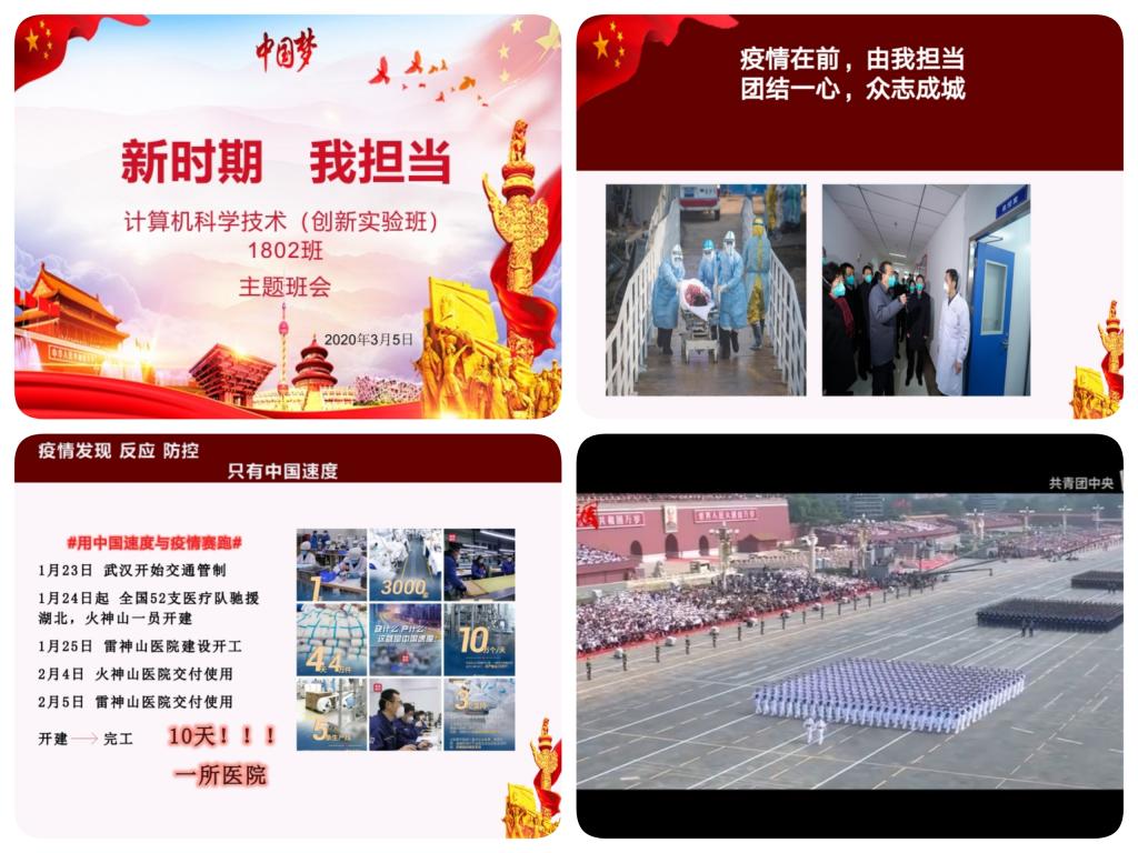 计创1802班的同学们共同回顾了建国七十年来的伟大成就,并播放了国庆节阅兵式的视频,时隔五个月再次观看这一盛事,依然让人心潮澎湃。计算机1802班的同学们将胸中激昂的爱国热情融入一首又一首红歌,在铿锵的乐声中传递对祖国的热爱。软件工程专业的同学们在线观看了视频《我的喜马拉雅》,并悉心发掘身边的每一件小事,将身边的令人感动的一点一滴汇聚成对祖国的感激之情。计算机1801班的同学们就如何实事求是,将爱国热情落到实处展开了激烈讨论。计创1801班的同学结合自身专业,介绍了国家推行发展大数据云计算人工智能的战略,坚定了同学们要发挥自身优势做出一番事业,为社会主义现代化建设添砖加瓦的决心。