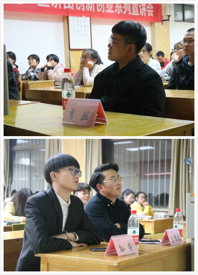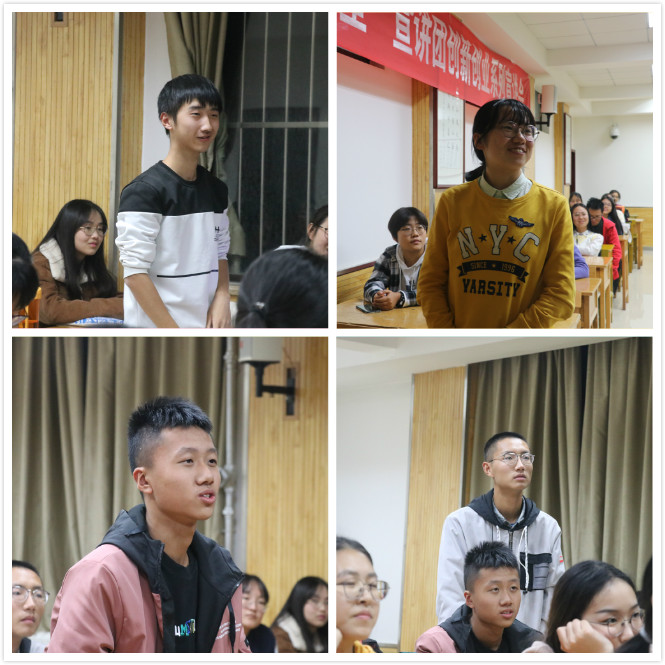 2019级及2018级本科生。侯秋源同学就“创青春”全国大学生创业大赛的办赛基础、创办时间、主办、承办单位、项目类型及发展历史等方面做了详尽的讲解,让同学们对“创青春”这项创新创业赛事有了更加全面、丰富、多元的了解。邢思瑶同学分享了创青春院赛的详细安排,并对项目初期孵化方式做了大致的讲解。她详细介绍了如何选择项目、如何组建团队、如何选择指导老师、如何撰写商业计划等,为同学们实际操作提供了更多的可能性。