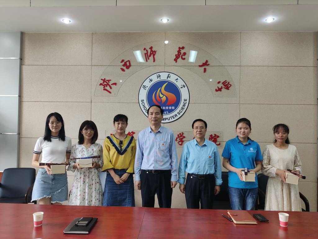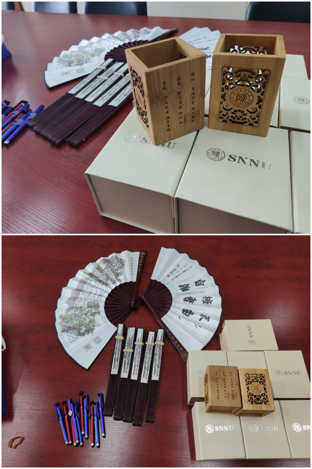 为四位同学赠送礼物,陕师大竹制笔筒、印有“抱道不曲,拥书自雄”的纪念扇和印有陕师大logo的纪念笔,希望同学们能传承学校和财神捕鱼