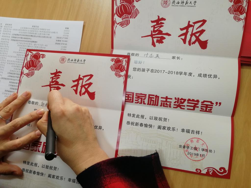 2018年度国家奖学金、国家励志奖学金、明德奖学金、叶圣陶奖学金、文源奖学金、感恩中国近现代科学家奖学金、隆基奖学金、海亮奖学金等奖项的获奖名单,学工组袁冰、郭康凌、毛庆、陈应权、卫晓等几位老师亲自为同学们书写喜报。学工组老师们提前通过电话、QQ等方式跟学生取得了联系,确认家庭住址、收件人、邮编等信息,确保了每一封喜报都能准确无误的送达到每一名家长的手中。