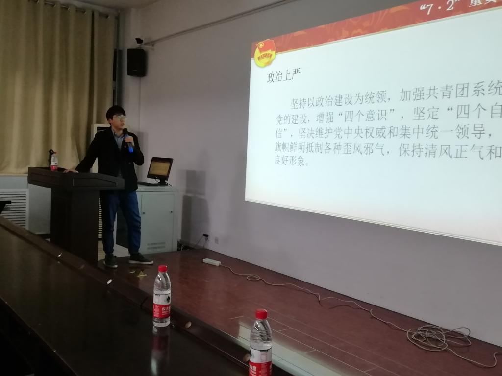 团委副书记、2016级计算机科学与技术专业冯苗苗、2016级计创专业马俊虎同学做《青年追梦与个人成长》的主题讲授。马俊虎分享了学习习近平总书记“7.2”重要讲话精神的体会,从党旗所指就是团旗所向、引领青年成为时代新人、保持清风正气良好形象三个方向展开授课,鼓励同学们要努力掌握专业本领,提高自身素质;他强调,要去“四化”强“三性”,青年一代要毫不犹豫坚持党的领导,坚定不移走中国特色社会主义群团发展道路。冯苗苗主要从团史、团的基本知识、团务工作、如何做一名合格的团干部四个方面入手,详细地介绍了团的性质、入团条件、离团、团籍的保留、团的全国代表大会等基本知识,分享了做一名合格的团干部的经验,要坚定理想信念、心系广大青年、提高工作能力、锻炼优良作风。