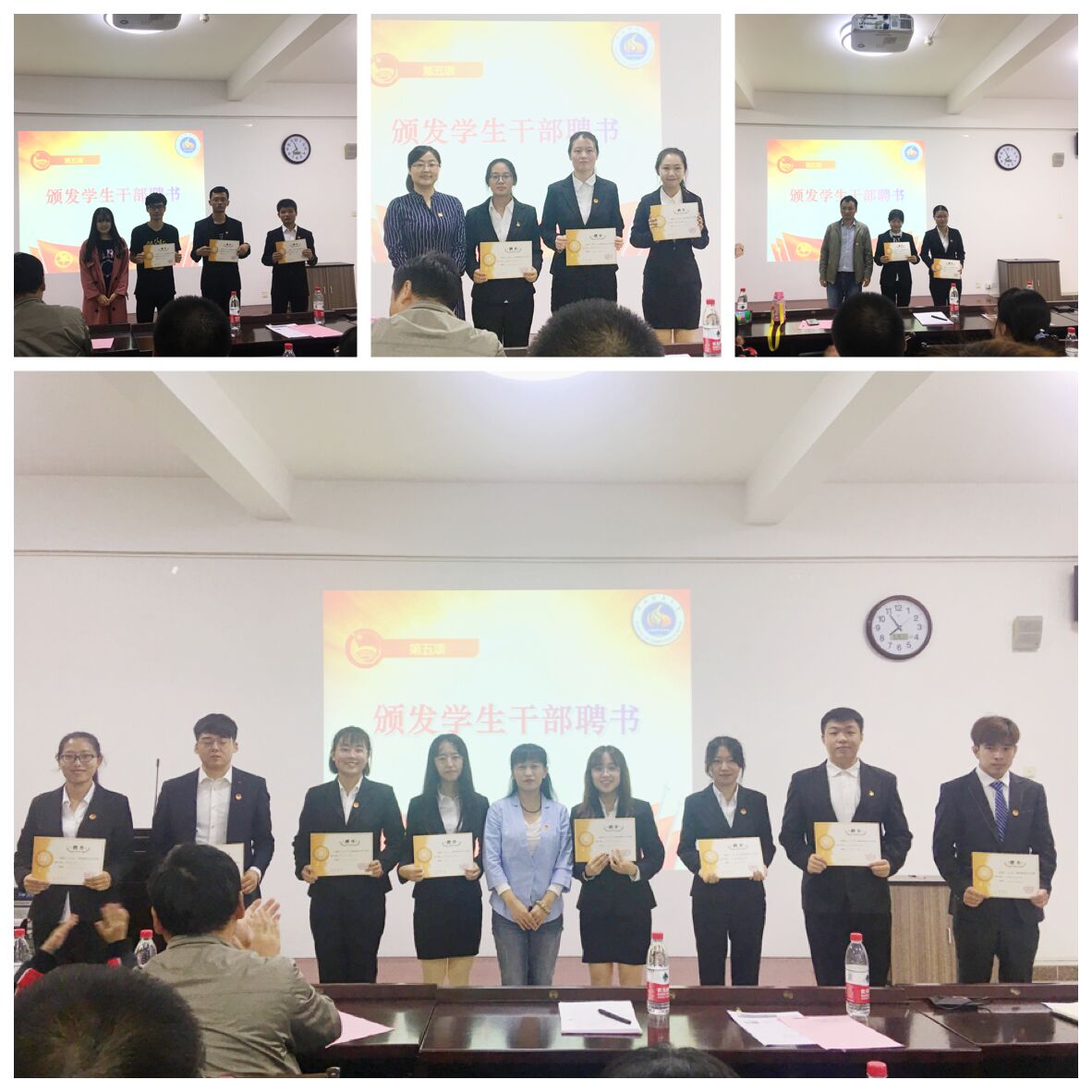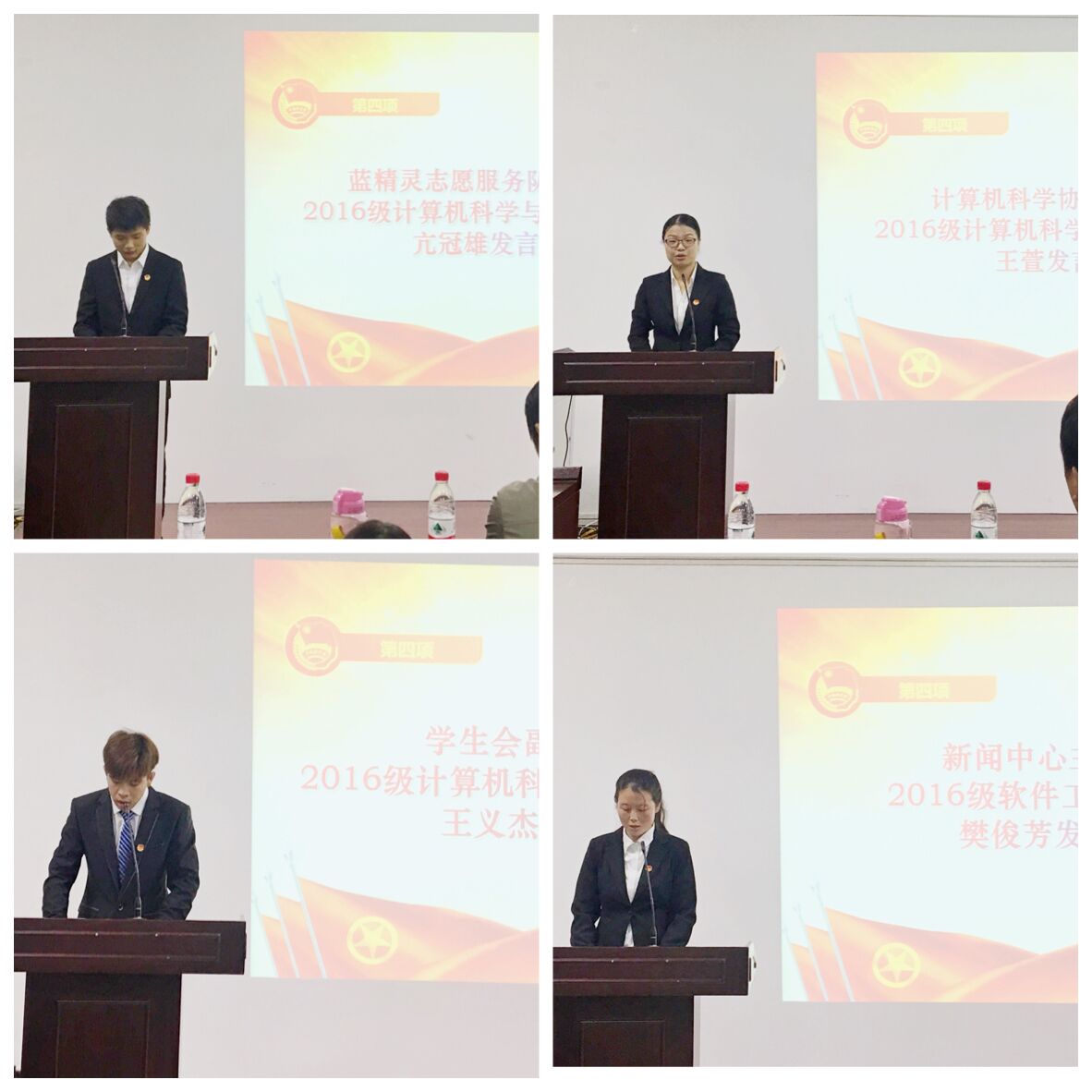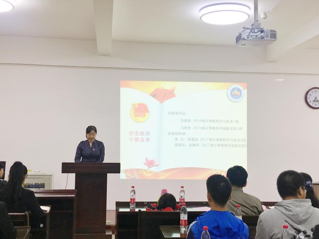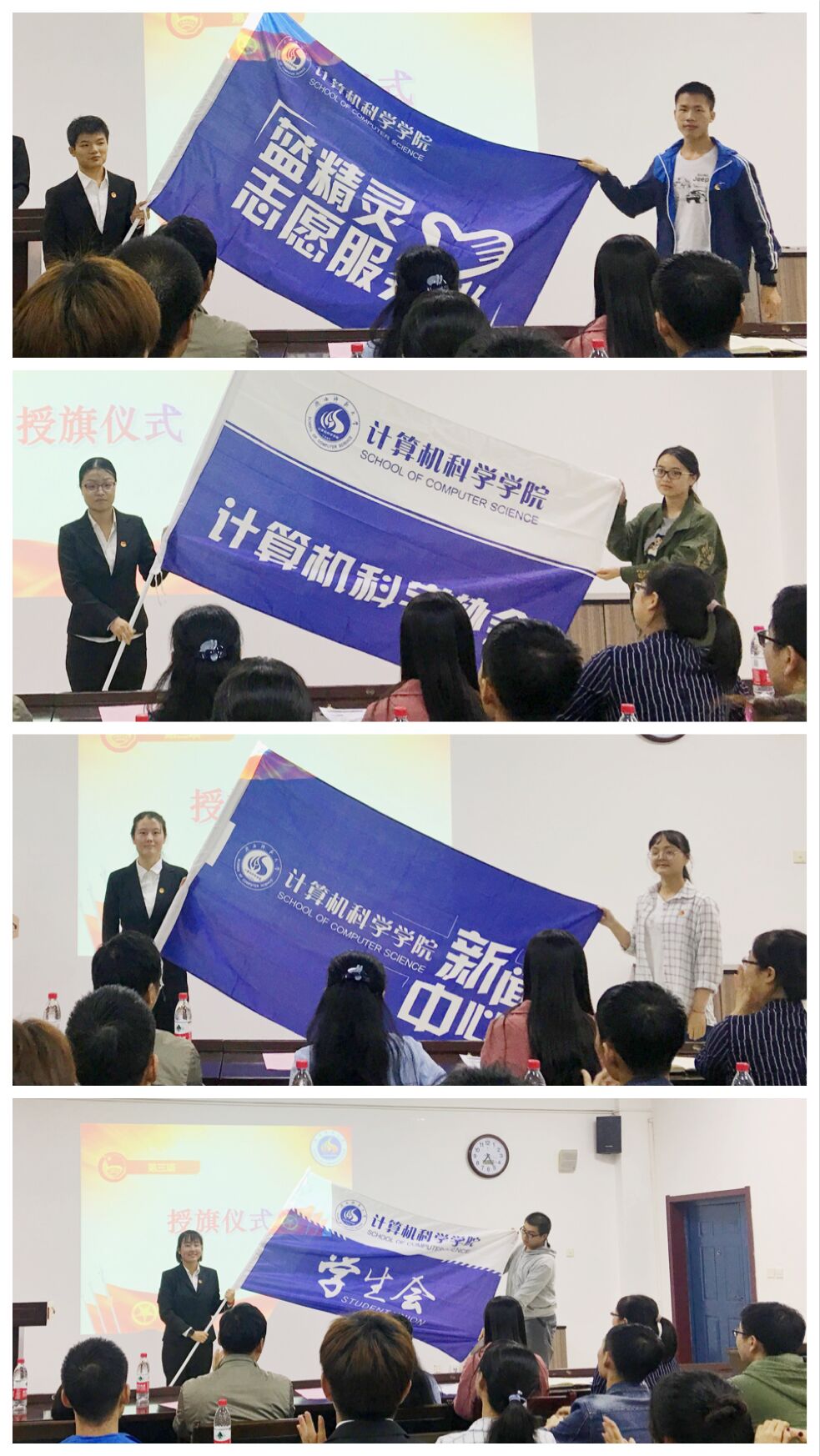 学生组织干部任职决定》。李文亮、刘佳华、刘童心、唐盼分别为学生会、财神捕鱼、为计科协和蓝精灵授旗。为增强各组织成员之间的集体感、凝聚力,会上还组织进行了交流活动。学生会副主席王义杰、财神捕鱼主任樊俊芳、计算机科学协会主席王萱、蓝精灵志愿服务队队长亢冠雄依次进行了发言,总结了上一年中所在部门的工作任务,并对未来的工作进行了展望、定下了目标。