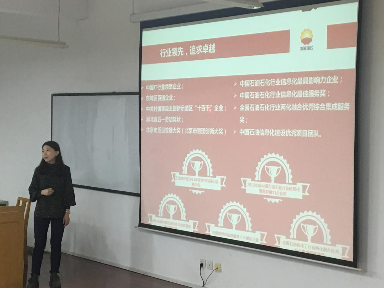 北京中油瑞飞信息技术有限责任公司是中国石油集团东方地球物理的全资子公司,是中国石油集团公司规模最大,综合实力最强的信息技术单位,主要面向能源,公共事业与金融等行业,为其提供规划,咨询,实施及运维,培训的一体化服务。会上,公司宣讲人为同学们详细介绍了公司的发展里程,核心业务范围,财神捕鱼,工作地点等内容,并通过图片向同学们详细展示了招聘流程,公司福利,入职待遇等内容。同学们就各自关心的问题进行了询问,公司负责人也都给予了耐心的解答。之后还进行了有奖问答环节,宣讲人就所讲内容进行提问,在得到同学们的正确答案后现场赠送了礼品,最后进入到了为时一小时的笔试环节并现场收取同学们的简历。招聘会后,部分学生与企业代表进行了更加深入的交流,至此,专场招聘会圆满结束。